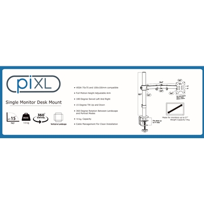 Constructed of strong steel tubing, the piXL Single Monitor Arm mounts to your screen to conveniently free up desk space. It holds a single 32 inch monitor up to 10kg compatible with VESA dimensions of 75x75mm 100x100mm Vesa or a 34 Inch monitor if 100x100mm Vesa
