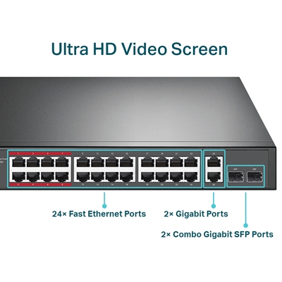 2 x gigabit RJ45 ports and 2 x combo gigabit SFP ports ensure smooth streaming even when 24x HD IP cameras work simultaneously.