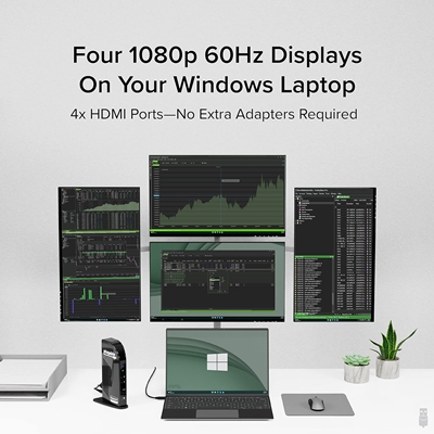 Get a Quadruple Monitor setup on Windows 10 or later and ChromeOS 100 or later with 4x 1080p displays @ 60Hz. Requires compatible USB4, Thunderbolt 4 / 3, or USB-C. Not recommended for macOS