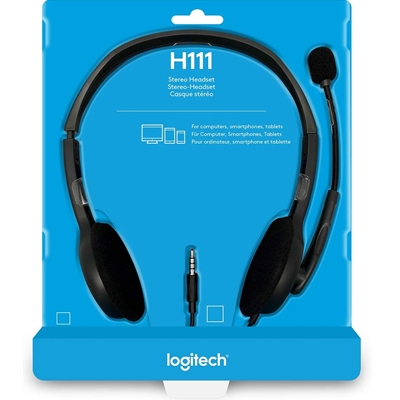 Logitech H111 Wired Headset, Stereo Sound, 3.5mm Audio Jack, Noise-Cancelling Microphone, Black