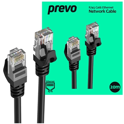 Prevo CAT6-BLK-20M Network Cable, RJ45 (M) to RJ45 (M), CAT6, 20m, Black, Oxygen Free Copper Core, Sturdy PVC Outer Sleeve & Clip Protector, Retail Box Packaging
