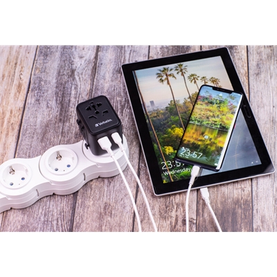 The Verbatim Universal Travel Adapter can be used in more than 180 countries – take it everywhere with you and never be out of power. This world-to-world multi plug will allow you to connect to any local power supply around the world and recharge your power-hungry devices, like laptops and camera batteries. The two USB-A ports on the bottom can charge all your USB devices including smartphones, Bluetooth speakers, tablets, power banks, and Kindles.
