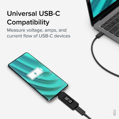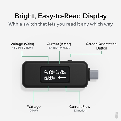 USB C Tester monitors USB-C power and charging up to 240W. Measure voltage and amperage. Visualize the directional flow of electrical current. Updated OLED display is brighter and easier to read. New orientation button lets you flip the screen 180 degrees